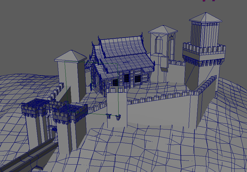 Élaboration d’abord d’un lore cohérent par rapport à l’univers du Seigneur des Anneaux pour inscrire la forteresse dans un contexte historique. Construction d’un set d’arbres, d’herbes, de fougères et de la forteresse dans Maya.