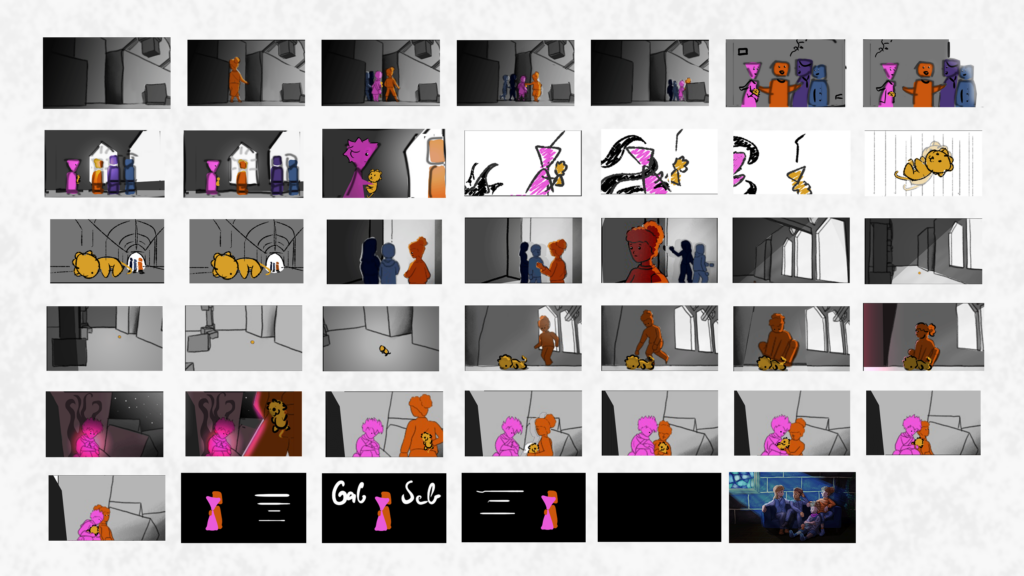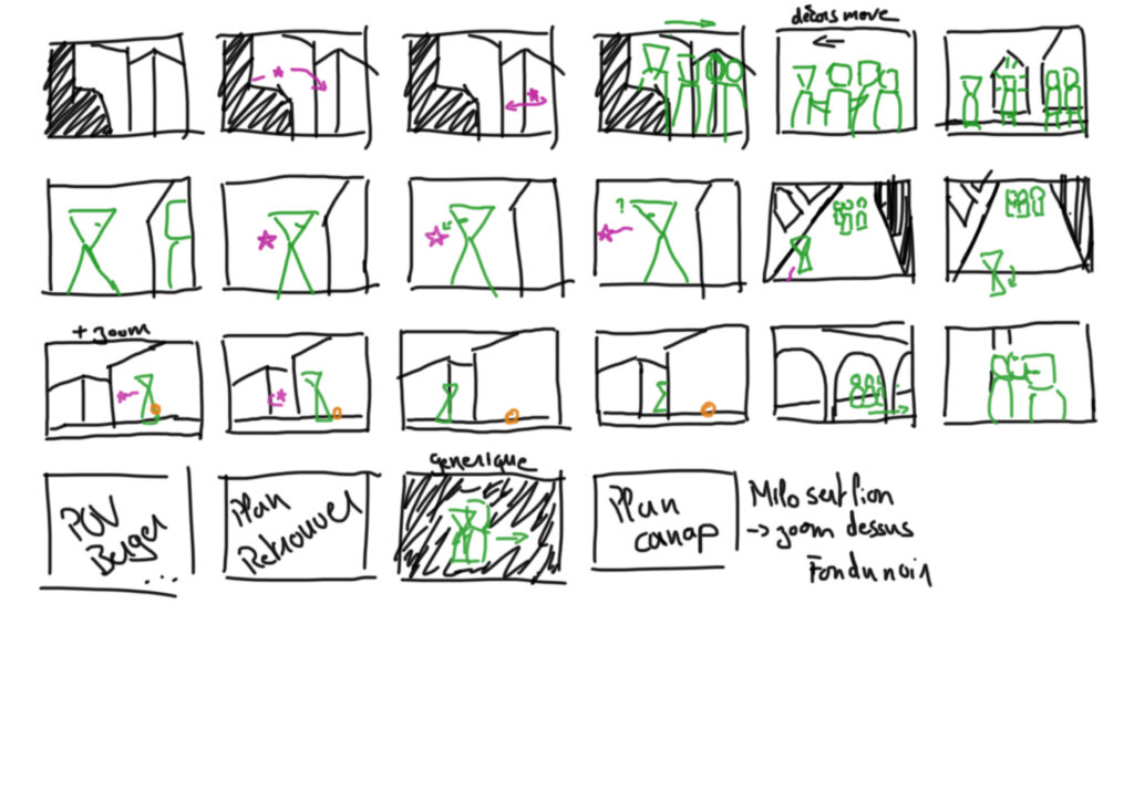 Pour cela, il était très important de construire un solide storyboard : l’enchaînement devait être compréhensible dès cette étape, puisqu’il n’y aurait pas d’inbetween pour relier les plans les uns aux autres.